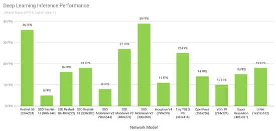 The autonomous flight of an Unmanned Aerial Vehicle (UAV) refers to creating a new flight route after self-recognition and judgment when an unexpected situation occurs during the flight. In the case of the UAV, the recognition and judgment of the UAV are used to measure the distance or avoid obstacles through object recognition by receiving data from various sensors such as a single camera [,,], a depth camera [,,], LiDAR [,], an ultrasonic sensor [,], or radar []. Furthermore, rather than employing a single sensor, complex sensors are increasingly being employed to compensate for the shortcomings of each sensor. Vision-based, ultrasonic, and infrared sensors are some of these, and if they fail due to the temperature or illumination circumstances, they might result in collisions. As a result, highly reliable industrial drones typically utilize a complicated sensor strategy. As computer vision and machine learning techniques progress, vision-sensor-based autonomous flight is becoming increasingly widespread. The drone sends data from sensors such as the three-axis gyroscope, three-axis accelerometer, magnetometer, GNSS, or barometer to the Flight Control Computer (FCC), which calculates the drone’s posture and keeps it stable in the air []. Accordingly, a separate Companion Computer (CC) is mounted to perform computing for image processing and autonomous flight. Unless it is a large Predator-class fixed-wing drone, the size and weight of the CCs are very important because most drones have little space to mount electronic parts. The CC used is mainly from the Raspberry Pi family and NVIDIA’s Jetson series for hobbies and development purposes. In particular, the Jetson model group includes a basic GPU and is small in size and light in weight, so even when mounted on a drone, the flight time is not significantly reduced, making it suitable as a CC for autonomous flight, object detection, and object tracking. In addition, autonomous drones recently released for hobbies or personal use are about USD 1000, and the price of realistic CCs must be considered, so development using Nano products among the Jetson models is actively underway. The Nano is small and has an excellent performance in graphic operation processing. However, detecting hundreds of objects among high-resolution images transmitted in real-time will inevitably lead to frame degradation. Drones can detect obstacles only when a minimum frame rate is guaranteed in proportion to the flight speed.
