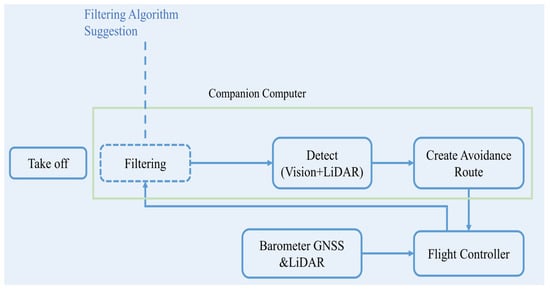 The process of creating an avoidance route for VAF. When the drone takes off, the drone receives data in real-time, then transmits the data to the flight controller. Following that, we use our filtering method to remove the small-sized objects, which may cause the the detecting time to become slower, then detect the object and create an avoidance route.