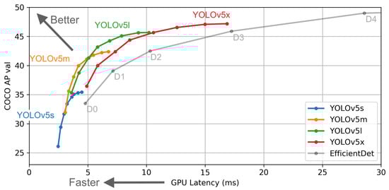 Table 2 shows the SSD family usually used at low FPS; this causes a long detection time, and the reason is that it divides several images and analyzes the images using the CNN model. On the contrary, the YOLO family runs fast because it searches only once. However, YOLOv3-tiny is a model with high FPS. Recently, the latest version of the YOLO family was published: YOLOv5. Figure 4 shows the performance of the mAP and FPS is improved due to some modifications to the model architecture. YOLOv5 is divided into four types: small (s), which has 12.7 million parameters, medium (m), which has 35.9 million parameters, large (l), which has 77.2 million parameters, and extra-large (x), which has 141.8 million parameters; these four types have the same backbone structure. This is directly related to the performance of the speed and accuracy, but there is a problem with the model slowing down as more resources are used. In this paper, we used the YOLOv5 small model, and for this, a real-time and light system were required, so we implemented our object detection using the YOLOv5 small model to ensure fast FPS.