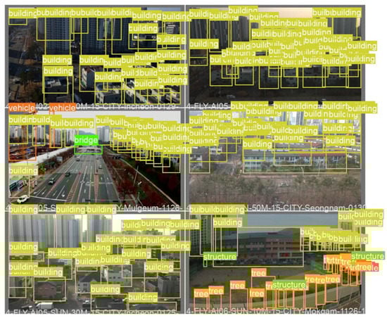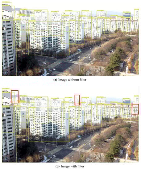 A feature of an altitude of 20 m is that various objects were detected. Objects such as people, vehicles, trees, buildings, and streetlights/traffic lights were all detected. In the case of a low altitude, there were small-sized objects, so resizing the input image reduced the accuracy, and filtering out small-sized items with filtering techniques did not work at this altitude. From an altitude of 40 m, large objects such as buildings and bridges were detected. This is the section where full-scale filtering began from this altitude and speed improvement occurred. The input image was 640 × 640 px, and the detection speed was 108.8 ms. We also reduced the detection time by resizing the image to 320 × 320 px in order to make it real-time. When filtering at a height of 20 m, 40 m, and 60 m, the result of employing 320 × 320 px was as presented in Figure 9. The reference process showed a 32.6% improvement from 108.8 ms to 81.4 ms. Therefore, it is important to avoid excessive resizing at low and medium altitudes and enter it at an optimized resolution. At an altitude of 60 m, the number of objects was reduced, and the majority of them were buildings. For the validation data, 120 photographed images wherein only building objects were detected at 60 m were extracted and evaluated randomly, and the results were compared before and after filtering using the same data. Among the results, there were 2835 objects detected before filtering, 23.6 objects per image, and after filtering, 2669 objects were detected, 22.2 objects per image. This shows an average error of 1.4. However, the object inference time before filtering was 0.105 s on average, and the object inference time after filtering was 0.066 s, showing a 59% performance improvement in the detection time.