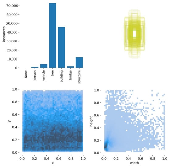 In Figure 5, we show that the recognized objects were mostly trees and buildings. As they were photographed from the perspective of drones, many objects were detected at once, and in particular, the recognition of objects as trees, apartment complexes, and general housing complexes accounted for the majority. The number of trees was the most at the horizon 0° angle of the drones, followed by buildings, streetlights, and traffic lights. In Figure 6, the coordinates of the objects were mostly positioned at the bottom 1/3 of the image and scattered with small sizes. In that case, it can be seen that the filtering was suitable because there were few objects to be detected when flying at a higheraltitude. In Figure 7, the confusion matrix can be checked after training the model by comparing the expected Y value produced by adding the X value into the model data with the actual Y value, in other words, as a result, showing how good the prediction was.