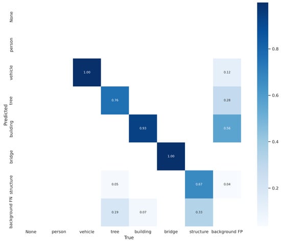 The confusion matrix after training the model. Vehicles, bridges, and buildings were able to be accurately detected, demonstrating how good the prediction was.