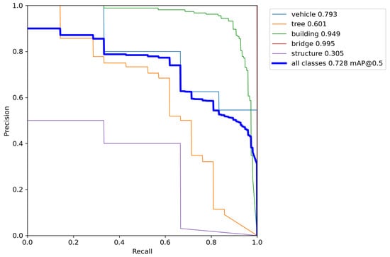 Figure 8 shows that the accuracy of each object was found to be high in the order of bridges (0.995), buildings (0.949), and vehicles (0.793). In particular, bridges and buildings are big, so they exhibited high accuracy even when resizing. As a result of the performance evaluation, the validation data for the verification of the 20 m, 40 m, and 60 m sections were detected.