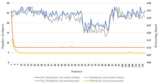 Table 5 and Figure 11 compare the filtering process and non-filtering process for each sequence. We used a filtering technique to filter objects such as people and vehicles when they were detected by the UAV at a high altitude; the size of these objects was very small in the images, but they were detected with no use of filteringwhen object detection was performed. The filtering technique was used because we wanted to remove small objects from the scene, which sped up the object detection. The reason we employed filters was to reduce the amount of effort spent detecting small-sized objects by deleting them. The initial sequence did not act as a large variable, as the data processing speed was partially delayed thereafter, but this would not act as a large variable as a result of the system environment irrespective of whether filtering was performed or not.