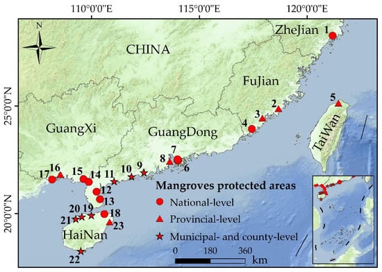 The study area covers six coastal provinces (Hainan, Guangxi, Guangdong, Fujian, Zhejiang, and Taiwan) and one special administrative region (Hong Kong). The geographical range of the study area is 18–29°N and 108–122°E (Figure 1). Yueqing County, Zhejiang Province, and Sanya City, Hainan Province, are the northernmost and southernmost boundaries of mangrove distribution in China, respectively. According to the spatial distribution characteristic of mangroves in China, 24 reserves (including 8 national-level reserves, 6 provincial-level reserves, and 10 municipal- and county-level reserves) with mangroves as the primary protection object were selected from the newest China Nature Reserves List and China Marine Reserve List (Table 1) [,].
