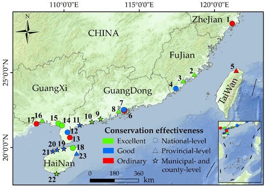 As the ecological and socio-economic functions of mangroves are increasingly valued in China, the government has issued a series of laws and regulations to protect mangroves. The number of mangrove reserves is increasing, and about 64% of mangroves have been protected []. However, the quantitative enhancement of mangrove reserves does not always guarantee qualitative improvement []. The conservation effectiveness evaluation is necessary to enhance the conservation level of mangrove reserves and promote the restoration of mangrove resources.