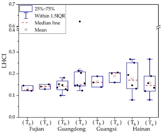 The amplitude of LHCI () is the difference between the value of LHCI at Ta and the value of LHCI at Tb, i.e., the net increase or decrease in the LHCI. A positive value indicates the improvement of mangrove landscape health status after protection, and a negative value indicates the deterioration of mangrove landscape health status after protection. The amplitude ratio of LHCI () is the ratio of the to the value of LHCI at Tb, which characterizes the significant degree of the improvement or deterioration of mangrove landscape health status after protection. The slope of LHCI () is the slope of the line fitted by the value of LHCI at each time point from Tb to Ta, which characterizes the changing trend of the LHCI after protection; a positive value indicates an increasing trend of LHCI, and a negative value indicates a decreasing trend of LHCI. The formula of and are as follows: