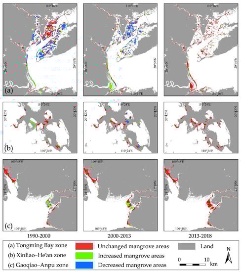 Changes of mangrove area in (a) the Tongming Bay zone, (b) the Xinliao–He’an zone, and (c) the Gaoqiao–Anpu zone after protection.