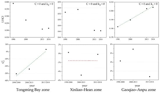 The LHCI and in Tongming Bay, Xinliao–Hean, and Gaoqiao–Anpu zones from 1990 to 2018. (The red dotted line represents the decreasing trend (), and the green dotted line represents the increasing trend ().)