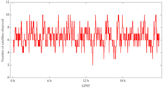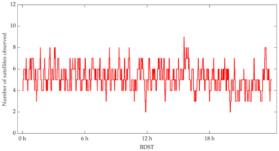 As can be shown from Figure 2, most of the epochs have at least four BDS satellites available, and there are an average of five satellites. However, the smallest is 2, and the biggest is 9. As can be seen from Figure 3, compared to BDS, the usability of satellites for GPS is much better, and most epochs have more than five GPS satellites, and the maximum is up to 10 GPS satellites. This is mainly attributed to the GPS constellation consisting of 32 MEO satellites, more than the current BDS constellation, and the fact that most BDS, GEO and IGSO satellites are located within the Asia-pacific region.