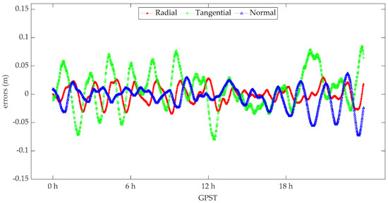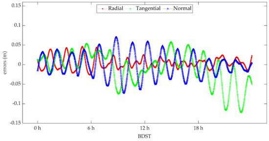 where, GM stands for geocentric gravitational constant, and are the position and acceleration of the satellite in the inertial coordinate system, respectively; refers to main perturbation acceleration excluded Earth center gravity, that includes the Sun and Moon perturbation, atmosphere drag, solar radiation pressure, Earth radiation pressure, solid Earth tide, ocean tide and so on. refers to the periodic radial, tangential, and normal (RTN) perturbation, which can make up for these unmodeled perturbation acceleration errors [26,27,28]. In this study, the tangential and normal perturbation parameters are estimated for the POD processing.