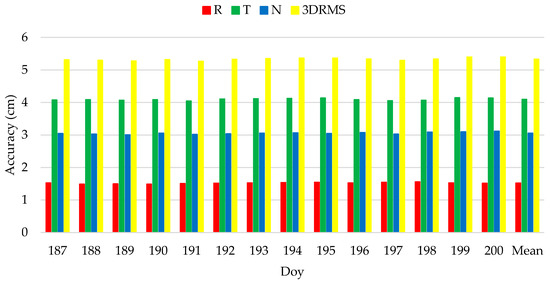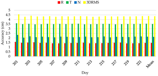 As can be shown from Figure 8 and Figure 9, the radial RMS values are basically 1.4~1.5 cm for BDS and GPS data, and the tangential and normal accuracies are slightly poorer compared to the radial direction. Overall, the precision based on spaceborne GPS data are slightly better than that of spaceborne BDS data, and the results are in agreement with the previous analysis, which shows that the used method and model strategies have a certain reliability. Moreover, Table 6 and Table 7 show the accuracy statistics of HY2D. As can be shown from Table 6 and Table 7, the average radial accuracy based on spaceborne BDS and GPS data are, respectively, 1.5 cm and 1.4 cm, the average three-dimensional accuracy are 5.3 cm and 4.3 cm, respectively. These results illustrate that the HY2D satellite, using spaceborne BDS and GPS data, can achieve the radial precision of 1.4~1.5 cm, the 3D position precision better than 5.5 cm, and the radial precision can satisfy high-precision altimetry applications.