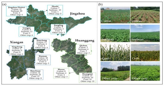 Sample diagram for three regions: (a) sampling distribution diagrams of Jingzhou, Xiaogan, and Huanggang; (b) photos taken in the field.