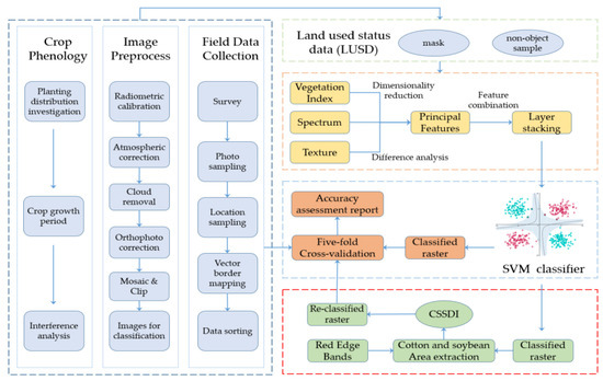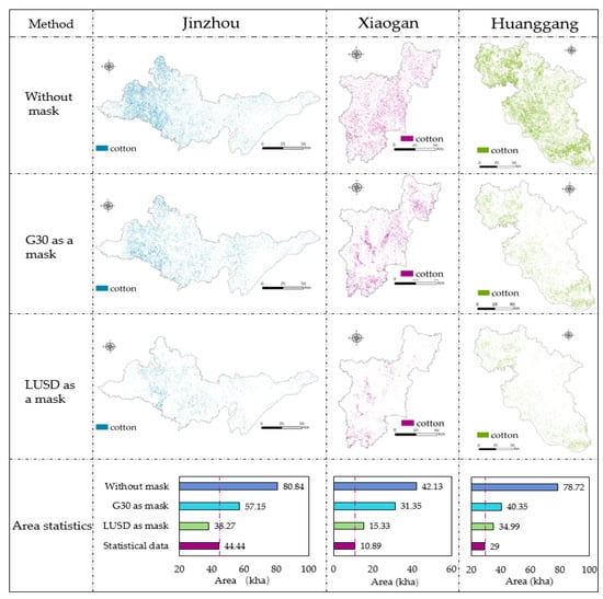 To further investigate the performance and explore the advantage of spatial constraint using LUSD, we used two other cotton extraction methods for comparison: (1) without mask and (2) using Globeland30 (G30) data as mask. G30 data provides a global geo-information product available online (http://www.globallandcover.com/, accessed on 10 September 2021). The cultivated land categories of G30 were used as a mask before classification. Aside from cotton, soybean, and corn, the SVM classifier includes a category for rice, which was also collected in the field. For the method without mask, three additional classes were added using visual interpretation to avoid misclassification of non-crops: water, building, and forest.