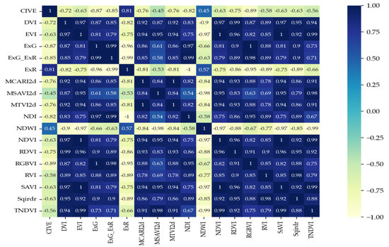 Each Sentinel-2 image has red, green, blue, and near-infrared bands, and all eight spectral bands can be obtained using two-period images. VI is a combination of reflectance of two or more wavelengths to enhance features or details of vegetation. To distinguish the two kinds of features in the paper, we refer to the original bands as spectral features and the band combinations as VI features. In this study, 18 VIs were calculated, and the summary of equations used is presented in Appendix A (Table A1). There were strong correlations among some VIs and spectral bands. Therefore, correlation analysis was performed, and features with high correlation were removed to reduce data redundancy. The correlation coefficient threshold was set to 0.9, and VIs and spectral features with more significant differences and small dimensionality were obtained. Figure 5 shows the correlation matrix for the vegetation indices.