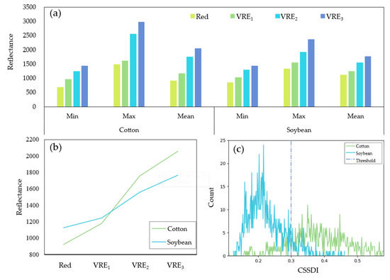 Cotton and soybean separation method: (a) Statistical values of reflectance (*10,000) of cotton and soybean in four bands, and VRE stands for vegetation red-edge; (b) cotton and soybean reflectance (*10,000) in red and red-edge bands; and (c) histogram statistics of cotton and soybean on CSSDI.