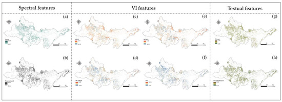 Features extraction results in Jingzhou: (a) Green band (late in August 2020); (b) Near-infrared band (late in September 2020); (c) NDVI (late in September 2020); (d) MCARI2d (late in September 2020); (e) RGBVI (late in September 2020); (f) RVI (late in August 2020); (g) Entropy (late in August 2020); and (h) Second Moment (late in August 2020).
