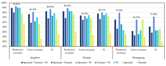 The three kinds of features were combined into seven classification schemes. The results for the cotton extraction using the SVM classifier are shown in Figure 8. Among the different schemes, the F1 values of the Spectral + VI configuration were highest in the three regions at 86.93%, 80.11%, and 71.58%, respectively. The producer’s accuracy for cotton was greater than the user’s accuracy by 12–17%. This suggests that the errors in the cotton area extraction were mainly due to the misclassification of other crops to cotton. In addition, the three evaluation indices for Jingzhou were higher than for Xiaogan and Huanggang, primarily caused by Jingzhou’s flat terrain, uniform planting patterns, and a consistent growth cycle for cotton. The confusion matrices of optimal results in three regions are listed in Appendix B (Table A2, Table A3, Table A4, Table A5 and Table A6).