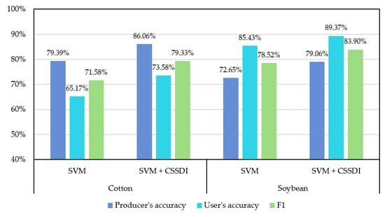 As shown in Figure 8, the three evaluation indices for Huanggang were much lower than for the other two regions, mainly because of misclassification between cotton and soybean. This study proposed a CSSDI based on red and red-edge bands to improve the classification results by further separating cotton and soybean. In Appendix C (Figure A1), different characteristics in the images of the same field can be found, leading to serious misclassification between cotton fields and soybean fields. As shown in Figure 9, the introduction of CSSDI improved the accuracy of cotton area extraction. Producer’s accuracy, user’s accuracy, and F1 increased by 6.67%, 8.41%, and 7.75%, respectively, and the final value of F1 was 79.33%. Similarly, CSSDI also improved the accuracy of soybean extraction. For Xiaogan and Jingzhou, since there were fewer mixed planted areas, the introduction of CSSDI resulted only in marginal improvements in cotton area extraction.