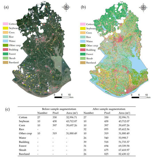 Sample augmentation using LUSD in Huangmei county: (a) ten kinds of samples distribution map; (b) classification results; and (c) sample number statistics before and after augmentation.