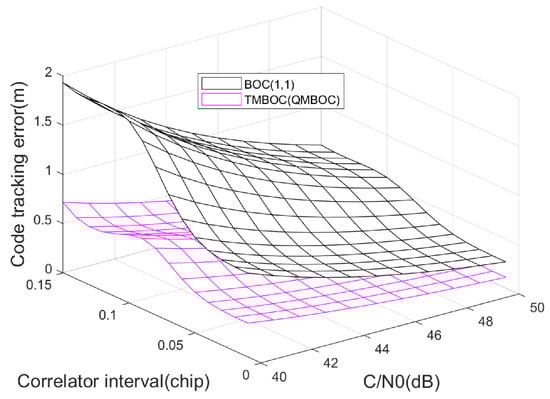 The tracking accuracy of the QMBOC and TMBOC signal codes as the pilot components overlaps in different C/N0 and correlator intervals. Their code-tracking error is lower than that of the BOC (1,1) signal as a pilot component.