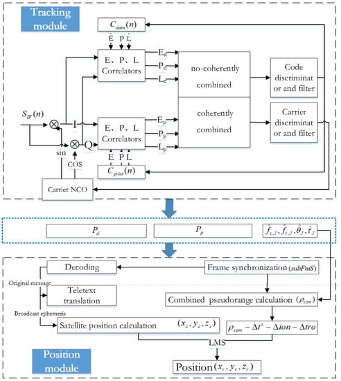 A pilot channel undergoes similar path delays and shifts to a data channel, thus making data/pilot combined tracking an attractive option. The two components have the same frequency, and the carrier phase relationship is fixed. The traditional single-component tracking method wastes useful power. Based on the specific relationship between the data and the pilot, the receiver adopts correlator joint receiving, where the total signal power is increased to obtain a higher tracking accuracy. The combination receiving design framework is shown in Figure 3, which includes a tracking module and a positioning module.