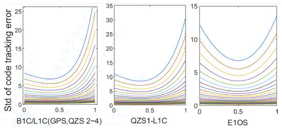 The std of code tracking error for the correlator joint (different colors represent different C/N0 conditions (25–50 dB)).