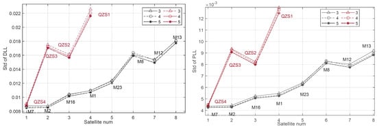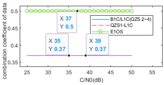 Figure 5 is a traversal of the minimum error std in Figure 4. It can be seen that, when the C/N0 is between 25 dB and 50 dB, the combination coefficients of B1C/L1C (QZS2–4) signals are = 0.37 and = 0.63.
