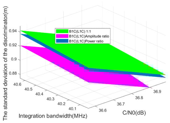 Figure 7 simulates the theoretical standard deviation of discriminator for the code loop in different phase-detector intervals. The simulation results show that the tracking method of amplitude ratio combination has the highest accuracy for the B1C and the L1C in the main lobe bandwidth (32 MHz), followed by the power ratio combination and, finally, the equal weight combination (1:1 combination).