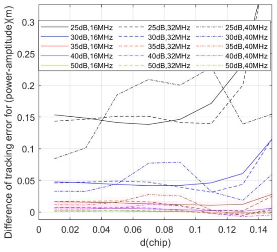 To further determine the accuracy of the combined reception of the L1C and the B1C signals, Figure 8 intensively simulates the difference in standard deviations of the DLL theory of the amplitude ratio combination and power ratio combination under common receiver parameters. The C/N0 of the GNSS ground receives a signal for ordinary users in ranges from 25 dB to 60 dB. Since the platform area designed by the MBOC (6,1,1/11) signal is prone to deadlocking the receiver, the users choose the discriminator interval to be within 0.15 chips. In the common receiving bandwidth of the usesr receiver, including the main lobe bandwidth (16 MHz), transmitting bandwidth (32 MHz) and wideband receiving (40 MHz), the difference between the DLL theoretical discrimination’s standard deviation of the power ratio combination and amplitude ratio combination is simulated for the B1C and the L1C.