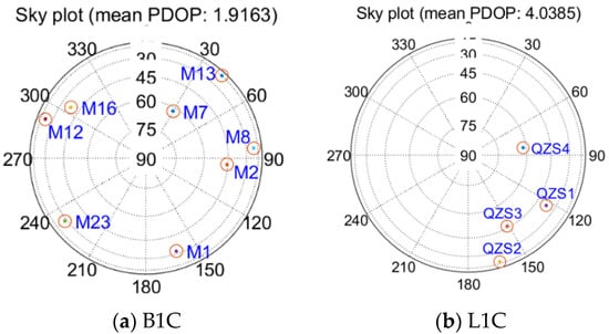 The std of the combined positioning error for the B1C signal is much smaller than the combined positioning error std of the L1C signal. The reason for this is that the space position accuracy (PDOP) of the BDS satellites participating in the positioning of this experiment, as shown in Figure 10, is far lower than that of the QZSS system. Most importantly, in the ECEF coordinate system, the UTM coordinate system and the GEO coordinate system, the std of the “amplitude ratio combined positioning” error of the B1C (L1C) signal is the smallest, followed by the “power ratio combined positioning” and the “1:1 combination” position”.