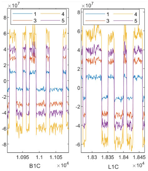 To make full use of all the energy of the two components, a combination is performed after the correlator. According to Table 1, the phase relationship between the pilot and data component is the same for the L1C (GPS, QZS2–4) signals. The phase relationship between the pilot and data component is orthogonal for B1C and L1C(QZS1). Consequently, the output of the correlator after combination can be expressed as follows: