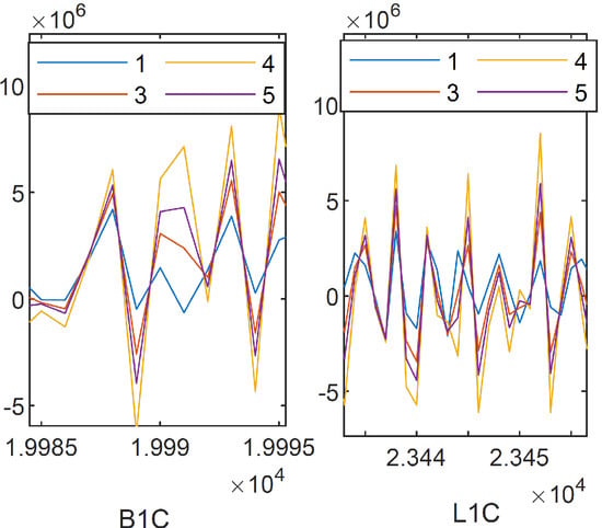 To further verify that the amplitude ratio combination is the optimal coefficient of the correlator combination, the following is a more comprehensive and detailed comparison of the traditional equal weight 1:1 combination method [], the power ratio combination method [] and the amplitude ratio combination method estimated in this paper. Table 2 lists three combinations of coefficient allocation schemes. For the B1C and the L1C, the three schemes produce different effects.