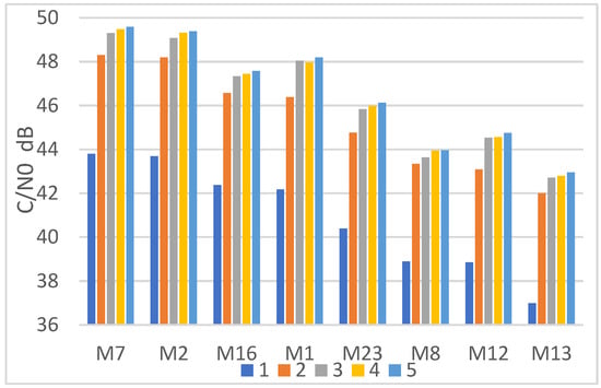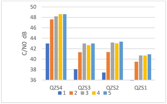 The C/N0 of the signal is calculated for different tracking schemes according to the above method, as shown in Figure 14 and Figure 15.