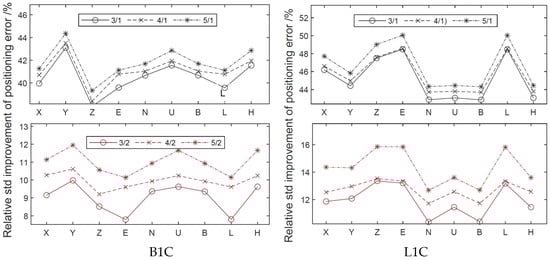 We compared the positioning accuracy improvement ratio in the ECEF coordinate system. In order to quantify the value into a number, we synthesize the errors in the three coordinate axes according to Formula (42).