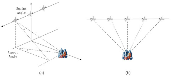 However, because of the backscatter imaging mechanism, features extracted from SAR images are highly sensitive to the SAR acquisition geometry [6]. With a slight change in the target pose or position, the scattering intensity and other characteristics of the same variety of targets can vary quite abruptly. On the other hand, as the aspect angle is limited in the radar observation at a time, some targets in the scene may be partly or even completely invisible, as the radar cross section (RCS) is partly determined by the corresponding aspect angle [7]. This kind of condition is especially true for man-made targets like the buildings, in which the scattering characteristics of dihedral angles are usually found [8]. In that case, it is commonly reckoned that multi-aspect images of the same scene always contain richer information and can provide better performance than any single of them in target detection tasks [9]. The data acquisition geometry in this paper is shown in Figure 1, where the images are captured by the same airborne sensor at consecutive aspects. Figure 2 takes a building area for example to show its different configurations at different aspects.