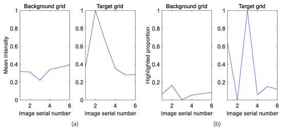where i is the sequence number of the bins in the histogram, j is the sequence number of multi-aspect images. N is the total number of bins in the histogram, is number of images involved. is the amplitude of the bin in the histogram. is the threshold set to distinguish bright pixels from others. is the mean value index of the image, is the highlighted pixel proportion index of the image. is the variance of the mean values, is the variance of bright pixel proportions. and are the two features both derived from the characteristic of intensity. In Figure 7a, which shows the mean intensity index in different aspects, the diagram on the left comes from a grid in the background area. We can see that it experiences a slow change as the aspect changes. The diagram on the right shows how the same index changes sharply in a grid of building area. In addition, we can see that the mean values of the two grids are quite close, indicating that there is no obvious difference based on the index amplitude alone. Figure 7b shows the highlighted proportions are of the same conditions.