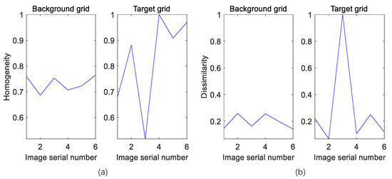 Our purpose is to obtain the texture of the grids in general for comparison between different images, instead of the elaborating characteristics of a certain image. In this condition, GLCM is only formed at the central pixel in each grid to represent the grid’s texture characteristic. Of all the texture values calculated from the co-occurrence matrix, we find that the indexes of homogeneity and dissimilarity can lead to the best distinction results via experiments. Figure 8 shows the normalized texture variations in multi-aspect images. Figure 8a compares the homogeneity variances in target and background grids, while Figure 8b compares the dissimilarity variances in the same conditions. The variances in different images are calculated as follows, where and are the indexes derived from the characteristic of texture.