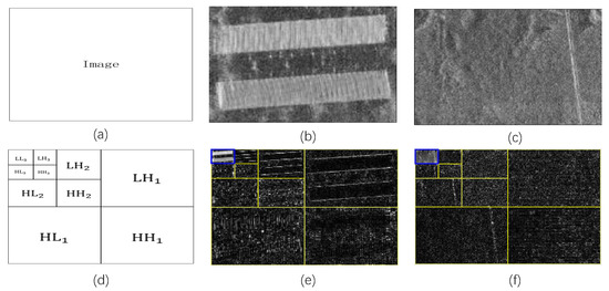 Three-level wavelet decomposition. (a) Original image to show principle of wavelet decomposition. (b) Original image of target region. (c) Original image of background region. (d) Schematic diagram of decomposition result. (e) Decomposition result of target region. (f) Decomposition result of background region.