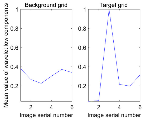 By column-stacking the from different aspect images, we get a matrix M represents the wavelet low frequency components. We calculate the mixed norm of M by calculating norm of each row in M and of the resulting vector afterwards. The value of is taken as the variance of wavelet components for each grid, in order to properly reflect the variation relationship among the components [22]. In the following formulas, is the amplitude of the bin of the histogram from the aspect. stands for the we used. For intuitive observation, the mean value of each low frequency component in different images is shown in Figure 10.