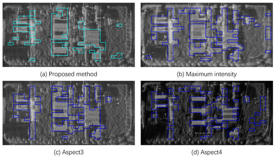 In images change significantly with aspects, the reliability of some traditional methods tends to be greatly affected. Shadowing happens to be one of the main factors that cause this degree of change. The change in shadow with aspects is immediate and noticeable, and can bring unavoidable interference to the work of target detection. For instance, geometrical properties are commonly used in building detection methods [22]. However, when the targets are partly shadowed by urban greening vegetation or other buildings nearby, their areas, contours, shapes and connectivity can be affected a lot. The presence of complex objects in the background will present great challenges for the detection. Figure 5 shows the influence of shadows at different aspects on building forms in SAR images. Therefore, a more robust approach that is not sensible to these factors is needed.