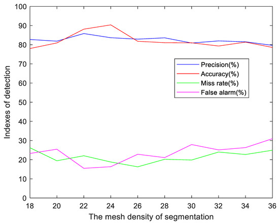 In the proposed method, the mesh density in the step of image segmentation is one of the critical parameters we must choose carefully. As the basis of feature obtaining, the area of the grids will certainly affect the actual accuracy of the experimental results. In order to provide insights into the determination of the grid number , we carry out experiments with different values of n. The range of n is set between 18 and 36, as we all know that when the value of n is too small, the presented accuracy value might be high, but it will not make any sense. From Figure 17, we can see the accuracy peaks at , which we choose to use in the experiments. When the partition is further refined, the calculation amount of the algorithm increases quickly, but the precision and accuracy decrease slowly. Besides, in both cases of false alarm and miss rate, is in a trough position. The PCC value in Figure 17 are taken from the average of different scenes.