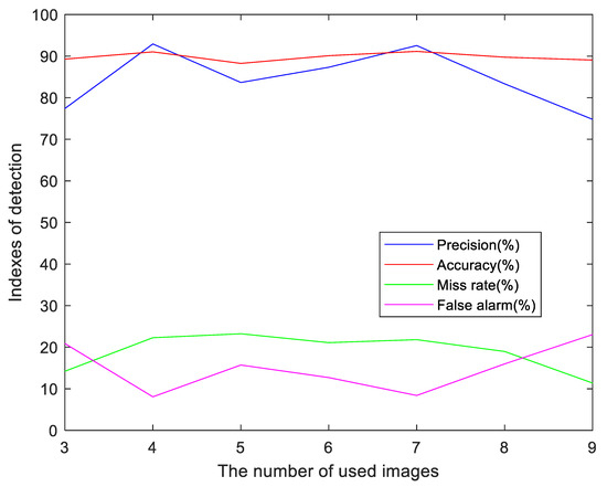 For the six images of Scene3, keeping all the other variables constant, we change the image number to observe the consequences. It is proved in Figure 18 that the proposed method is insensitive to the number and interval of images, but it is still beneficial to increase the number appropriately, even if no new images are actually added in this process. That is to say, the reuse of existing images can improve the detection performance effectively, especially when the image number is limited. Through multiple experiments we also find that the maximum intensity image can be also used as material of the repetition. However, excessive repetition on limited images does not lead to optimization of results.