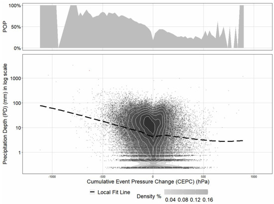 Relationship between precipitation depth (PD) and probability of precipitation (POP) vs. cumulative event pressure change (CEPC).