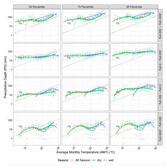 The seasonal relationship between PD, AMT, and CEPC in different percentiles is investigated in Figure 5. Of the PD figures, 50%, 75%, and 95% are extracted from the pooled data for analysis. Other than the four-season partition, the wet season (June to October) and the dry season (November to May) are selected for discussion. Local regression lines are plotted for each season as well as the data for the whole year. Horizontally in Figure 5, the change in precipitation against AMT is subject to the magnitude and the type of PCE. Generally, PD changes more significantly under intensive CEPC in both directions. CEPC ranging from −300 hPa to 300 hPa does not provide sufficient power to extract moisture from the air when precipitation forms. For CEPC magnitudes beyond 300 hPa, either higher or lower, the change in PD is much more pronounced. Under intensive CEPCs, the C–C relationship is represented by the data when AMT is greater than 20 °C or when AMT is lower than 14 °C. For AMT > 20 °C, PD trend lines of all percentiles and both InPCE and DePCE lay parallel to the 7% rate. Discrepancies exist, however, when AMT < 14 °C. Specifically, a sub-C–C relationship can be observed for DePCE under CEPC < −300 hPa, and a super C–C relationship is shown for InPCE under CEPC > 300 hPa. This difference could be due to the mechanism of precipitation formation in different seasons, as discussed later. In Figure 5, PD shows various trends in different AMT and PCE types and percentiles. When AMT is higher than 20 °C, whether during the wet or dry season, PD increases at the 7% C–C rate for both intensive InPCE and intensive DePCE in all percentiles [9]. This is because intensive convections can completely extract moisture from the air to form precipitation. When AMT is lower than 12 °C, PD increases to higher than 7% under intensive InPCE conditions, while the rate for intensive DePCE is lower than 7% in all percentiles. The main mechanism of precipitation formation is frontal movement, specifically cold fronts and warm fronts. The period of AMT < 12 °C corresponds to the spring season, during which the warm front dominates. A warm front is formed by the advance of a warm moist air mass and the simultaneous slow retreat of cold dry air. Typically, warm air moves from the southeast to the northwest in the northern hemisphere. Since warm air has a lower density, it rolls up and over the cold air and can cause light to moderate precipitation over a large geographic area. In this case, the ground-measured temperature is usually lower than the warm precipitation, causing air mass to roll up at high altitude. In other words, the change in PD of AMT < 12 °C actually corresponds to a wider temperature change than that observed from the ground.