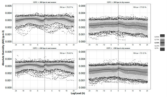 Quantile ranges of absolute humidity (AH) in extreme pressure change events (PCEs) responding to precipitation. The solid center line at 0 h indicates the start of precipitation. Seasons (dry and wet) and cumulative event pressure change (CEPC) are used to categorize the analysis [28].