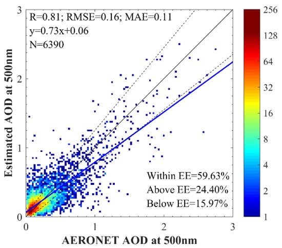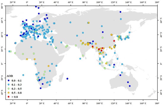 AERONET consists of a global ground-based network of sun–sky photometers [40] that provides near continuous (typically every three minutes) daytime measurements of spectral solar irradiance, spectral AOD, water vapor, and inversion aerosol products. AERONET stations provide long-term spectral AOD ranging from visible to near-infrared (NIR) channels (340–1020 nm). The AERONET AOD has a low positive bias of 0.02 (in AOD, unitless) and one sigma uncertainty of 0.02 [41] and is commonly used as a reference dataset for satellite AOD product validation. The AERONET data are categorized into three different quality levels: L1.0 (unscreened), L1.5 (cloud-screened), and L2.0 (cloud-screened and quality-assured). In this study, AOD data at 500 nm with quality Level 2.0 from the latest Version 3.0 [41] were used. All the version 3.0 AERONET data over the 329 AERONET stations between 30°W–160°E and 60°N–60°S during 2013–2020 were used for training and validation. The area covers most of Asia, Europe, Africa and Australia.