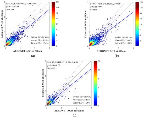 In this study, the AERONET AOD measurements observed within a relatively large temporal window (±30 min) centered at the Landsat-8 acquisition time were averaged as the AOD training data (Section 3.1). To examine whether a smaller temporal window has a better accuracy, we collocated samples using ±5 min and ±15 min temporal windows. To be specific, the AERONET AOD within ±5 min and ±15 min of the Landsat-8 acquisition time were averaged as the AOD and their leave-one-station-out cross-validation results are shown in Figure 6a,b, respectively. As expected, the smaller temporal window generated a smaller number of collocated samples. There is little accuracy difference between the ±15 min (Figure 6b) and ±30 min (Figure 3b) temporal collocation window results. The validation accuracy of the ±5 min window results is slightly inferior to the validation accuracy of the ±15 min and ±30 min window results. This may be because of the smaller number of collocated samples (4608), resulting in insufficient DNN training. Consequently, a relatively large (±30 min) window is used in this study to gain more training samples. Such large temporal window has been applied in AOD validation studies [37,59].