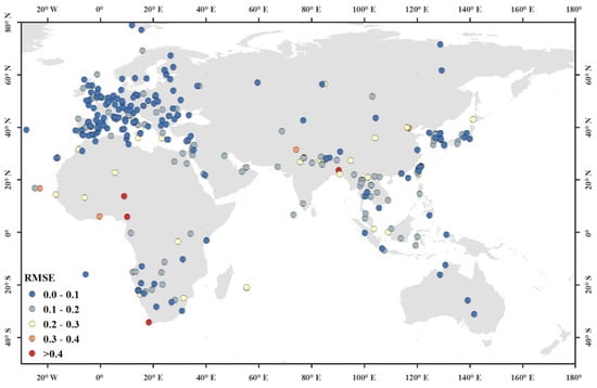 The AERONET station specific RMSE for the leave-one-station-out AOD validation.