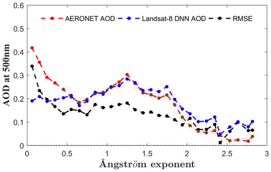 RMSE in DNN-estimated AOD as a function of Ångström exponent. AERONET AOD, Landsat-8 DNN AOD, and their RMSE are shown in red, blue and black dotted lines, respectively.